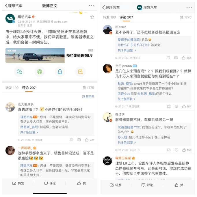 就在理想L9于6月21日上市的當晚,理想App就因預訂量火爆而出現了宕機。對此,理想汽車在官方微博中表示,正在緊急修復服務器,并對宕機的情況“深表歉意”。