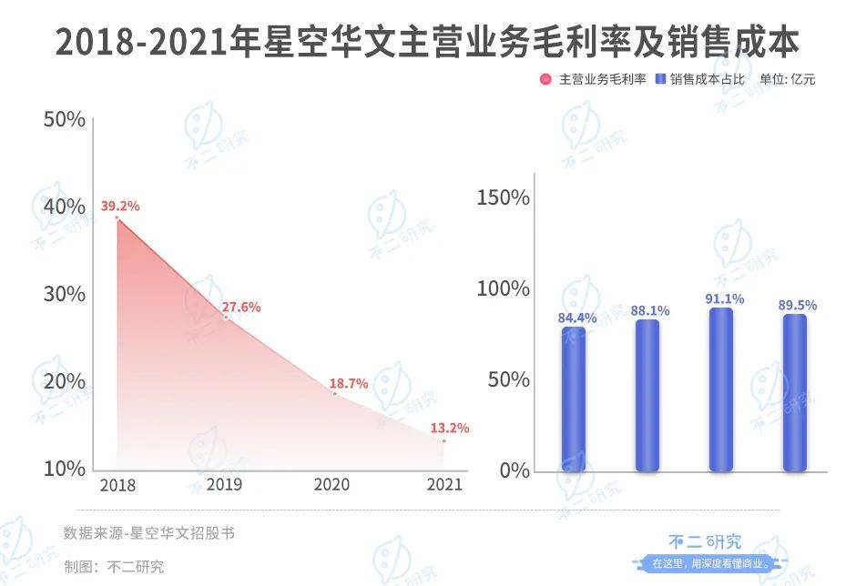 與此同時,毛利及毛利率的情況也不樂觀。2018-2021年,星空華文的毛利分別為8.25億元、7.05億元、5.87億元和2.74億元;毛利率分別為47.5%、39.0%、37.7%和24.3%。