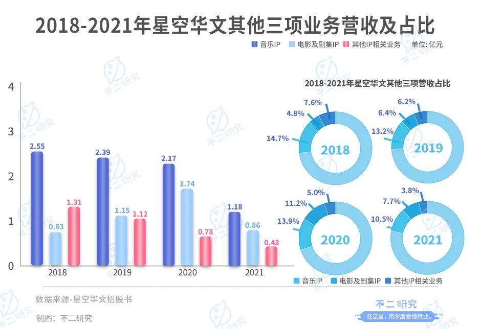 其他IP相關業務2018-2021年營收分別為1.31億元、1.12億元、0.78億元和0.43億元;分別占總營收的7.6%、6.2%、5.0%和3.8%。
