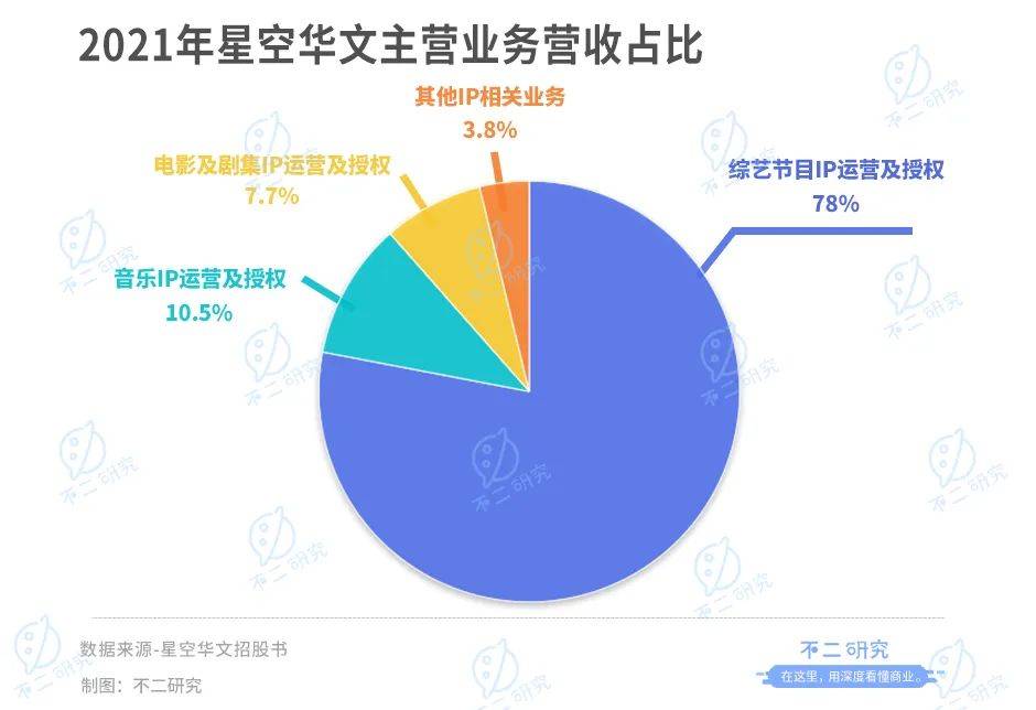 星空華文的主營業務分為綜藝節目IP運營及授權、音樂IP及授權、電影及劇集IP運營及授權和其他IP相關業務。其營收在2021年分別占總營收比重78%、10.5%、7.7%和3.8%。