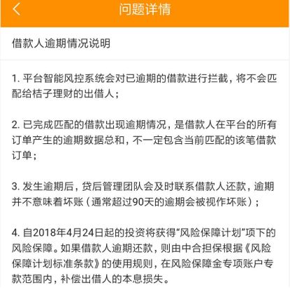 針對借款人逾期,桔子理財給出了四項處置措施說明:1、平臺不再向逾期借款人放款;2、逾期的不一定是該筆訂單;3、逾期并不意味著壞賬,超過90天的逾期才算壞賬;4、如果借款人逾期還款,出借人本息將由風險保障金賬戶補償。