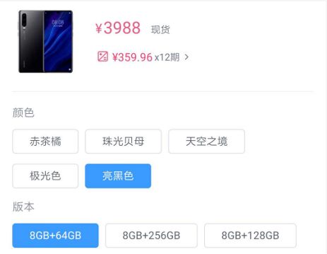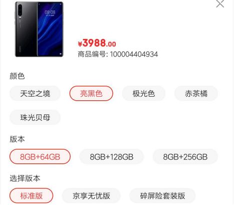 京東自營華為P30(亮黑色)8GB+64GB版本的售價也是3988元。