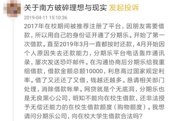 另一位網友在“黑貓投訴”發帖稱,其在2017年上學期間,因朋友需要借款,用自己的身份在分期樂開始了第一次借款,直到2019年3月一直按時還款,但4月份開始個人失去還款能力,分期樂電話轟炸,屢次發恐嚇郵件。在溝通協商后,分期樂向其重組借款(應該是重新授信的意思),借款總額1萬元,利率高過國家規定,借了還還了借,錢越還越多。