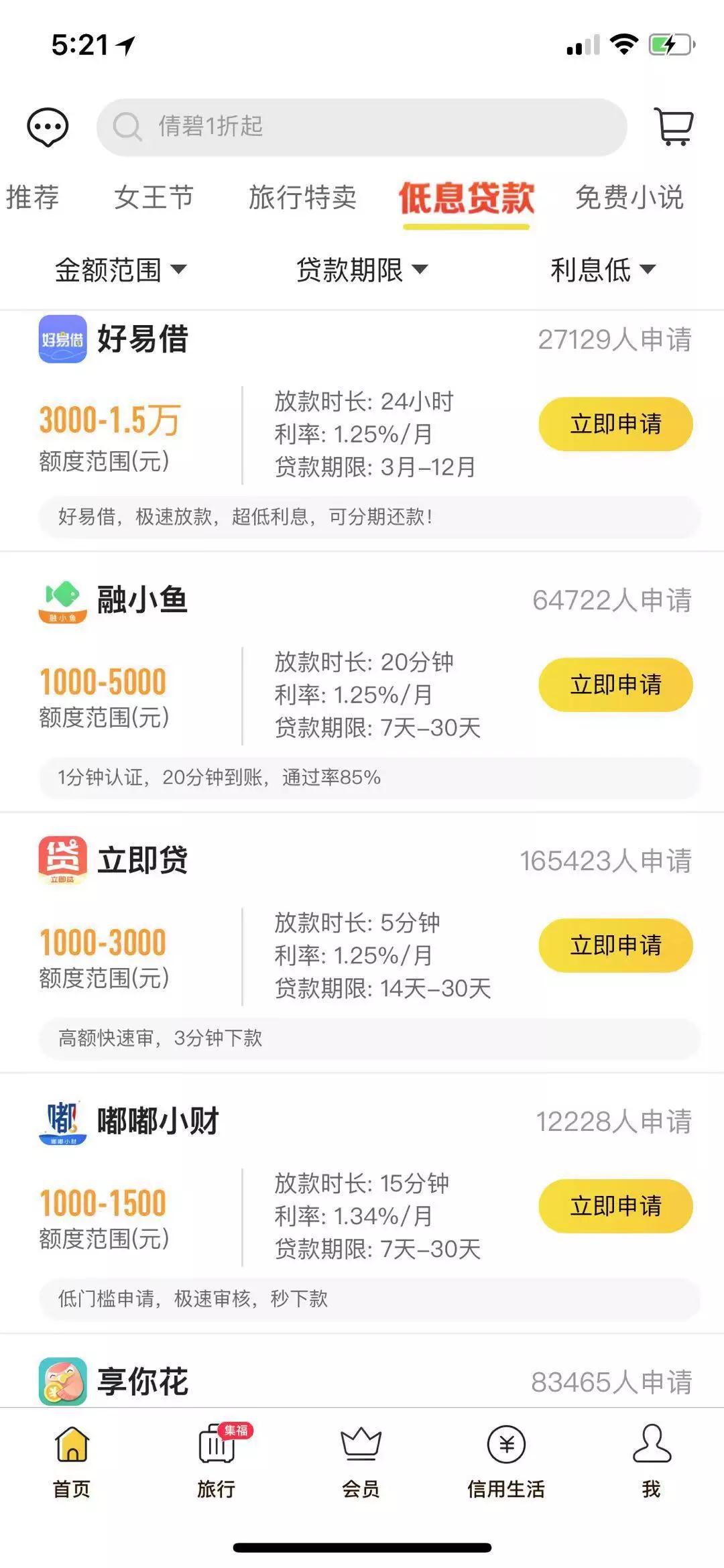 金小鯨下載小黑魚app后發(fā)現(xiàn),除商品購(gòu)買、酒店預(yù)訂等功能外,菜單欄的“低息貸款”格外醒目。其“低息貸款”頁(yè)面主要為貸款超市功能,除了為洋錢罐借款、你我貸、閃銀、用錢寶、小贏卡貸等借款平臺(tái)導(dǎo)流外,列表中還有諸多疑似“馬甲”平臺(tái)。