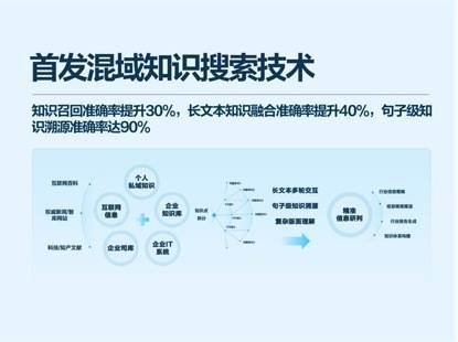 考慮到不少用戶在寫報告、做調研這類工作時,往往需要花費大量時間搜集信息、整理資料,基于圖文、長文本能力的提升和行業(yè)應用能力的積累,訊飛星火行業(yè)首發(fā)了混域知識搜索技術。該技術能夠實現(xiàn)對個人知識、企業(yè)知識、業(yè)務系統(tǒng)數(shù)據(jù)、精品行業(yè)數(shù)據(jù)以及互聯(lián)網信息的綜合搜索,用戶只需一次提問,即可獲得綜合搜索后的結果,大大提升信息搜索效率。
