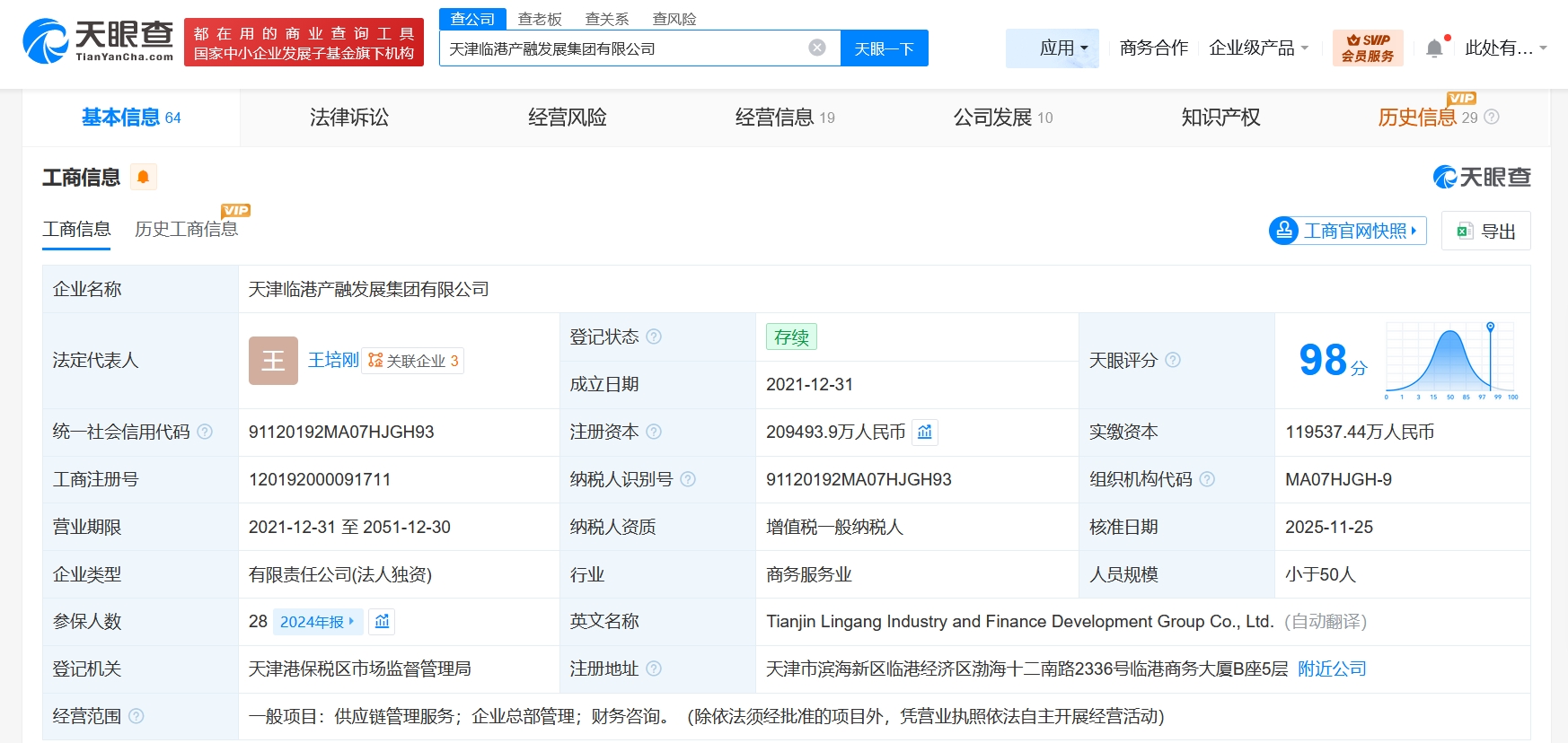 該公司成立于2021年12月,法定代表人為王培剛,經營范圍為供應鏈管理服務、企業總部管理、財務咨詢。股東信息顯示,該公司由天津臨港投資控股集團有限公司全資持股。