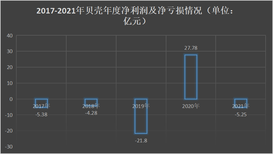 首先是由嬴轉虧的業績。據財報數據顯示,2021年貝殼全年凈虧損5.24億元,同比下降172.75%;經調整后凈利潤為22.94億元,同比下降60%。