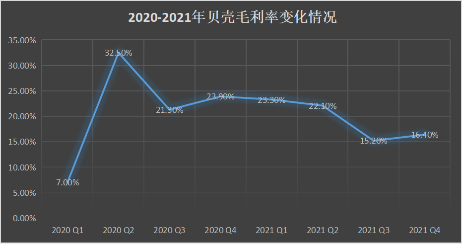 其次是逐步下滑的盈利能力。2021年貝殼的毛利同比下降6.2%至158億元,毛利率從上年的23.9%下降至19.6%。