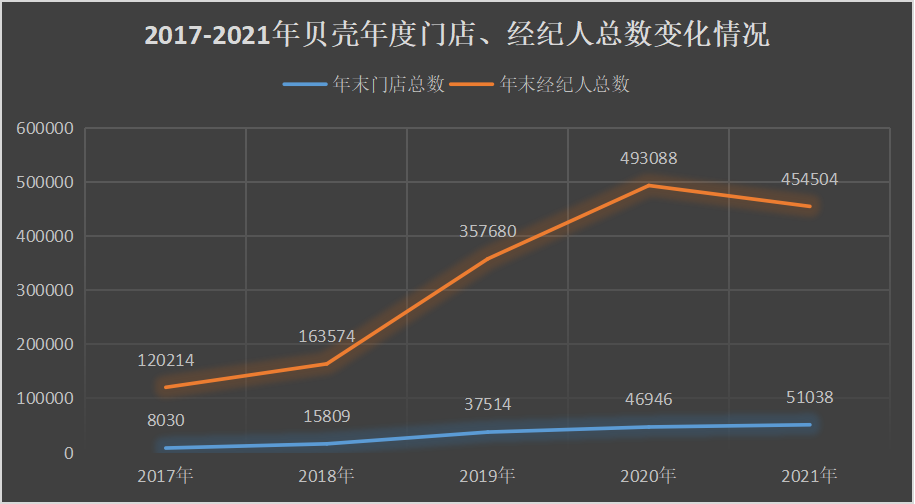 最后是大規模的閉店和裁員。2021年四季度,貝殼平臺門店數環比減少2908家;解約門店數約4100個,較三季度增加約400個;新增門店數較三季度減少約2300家。與此同時,截至2021年末,貝殼的經紀人人數為454504人,同比下降7.8%。