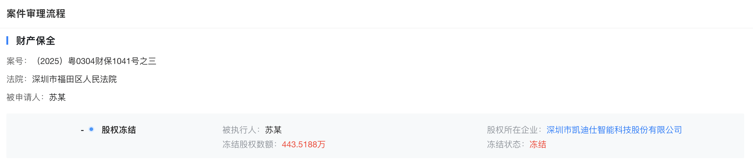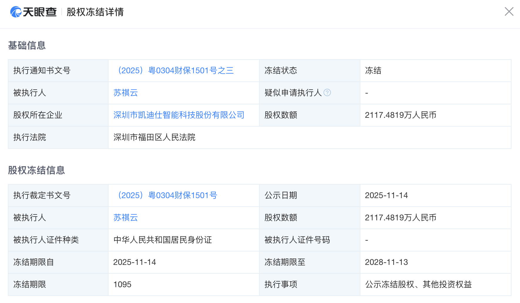 天眼查顯示,蘇祺云所持深圳凱迪仕2117.4819萬元人民幣股權、深圳領凱企業管理合伙企業(有限合伙)7.31萬元人民幣出資額,本月被深圳市福田區人民法院凍結。