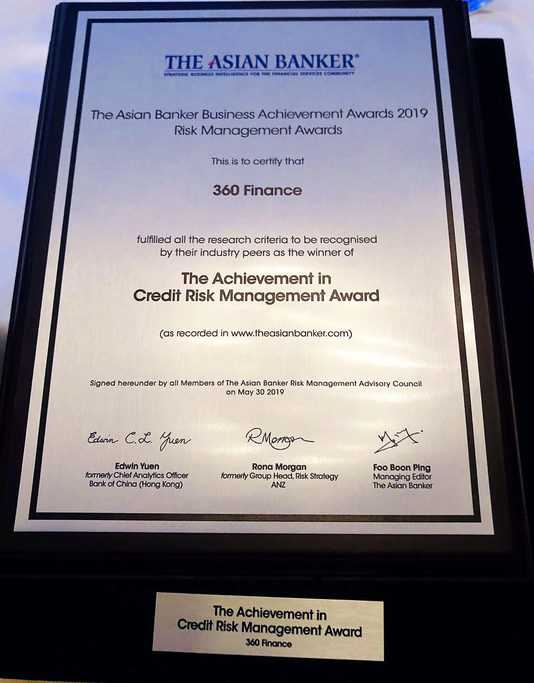 2019年5月30日,由《亞洲銀行家》舉辦的“2019年未來金融峰會”在泰國曼谷舉行,360金融憑借在風(fēng)險管理方面的卓越成效,榮獲《亞洲銀行家》“信用風(fēng)險管理獎”(The Achievement in Credit Risk Management Award)和“金融技術(shù)創(chuàng)新獎”(Best Process Automation Initiative Application or Programme)兩項大獎。“信用風(fēng)險管理獎”是亞太地區(qū)在風(fēng)險管理領(lǐng)域?qū)I(yè)性最強(qiáng)及最具聲望的獎項之一,評比規(guī)則嚴(yán)格遵循國際最高標(biāo)準(zhǔn),360金融成為唯一獲此大獎的中國科技公司。