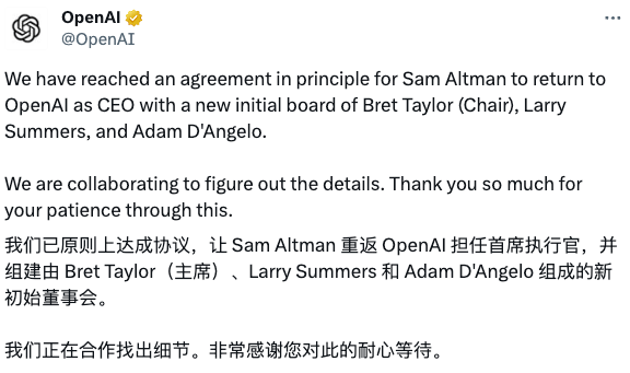 最終,以奧特曼回歸重新擔任 CEO ,并洗牌董事會落了幕。