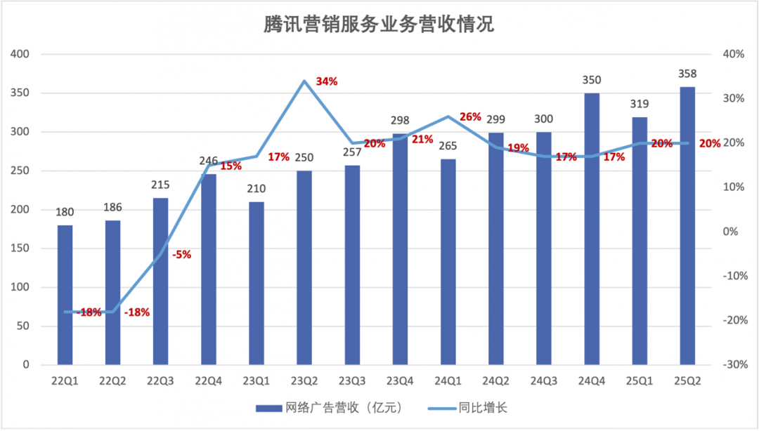 騰訊二季度網絡營銷服務營收創下歷史新高,同比增長20%至358億元,這是騰訊廣告業務連續第11個季度實現雙位數增長。