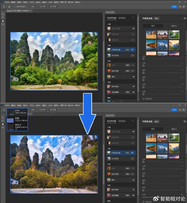 ▲在英特爾酷睿平臺上,Photoshop 2024依托于AI神經(jīng)網(wǎng)絡(luò)濾鏡能疾速實(shí)現(xiàn)超多的特效,比如風(fēng)景照片的春夏秋冬交替。