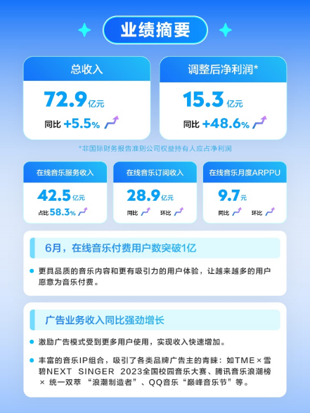 財報數據顯示,騰訊音樂第二季度總營收為72.9億元,同比增長5.5%;歸屬于騰訊音樂股東的凈利潤為13.0億元,同比增長51.6%。
