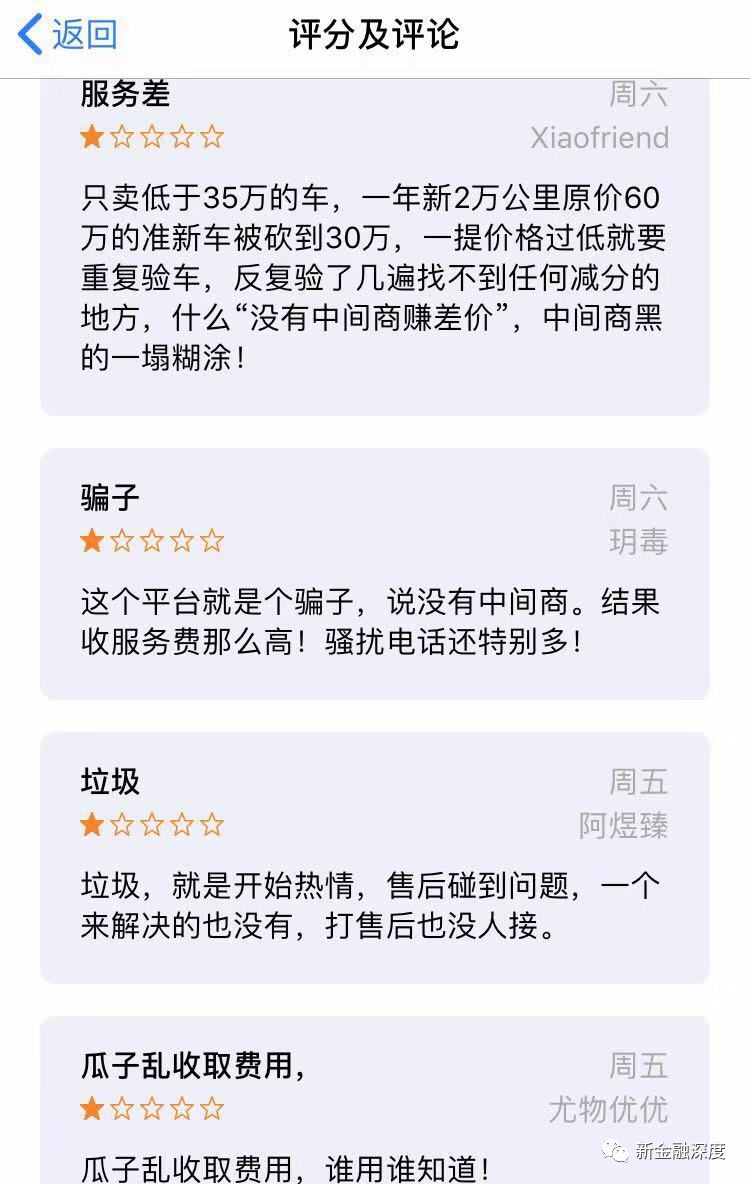 聚投訴資料顯示,截至3月12日,與相關(guān)的投訴共627條,投訴內(nèi)容包括車輛復(fù)檢不合格、與宣傳不符、押金難退、電話頻繁騷擾等。應(yīng)用市場中的口碑也不容樂觀。以安卓系統(tǒng)的應(yīng)用商店為例,對瓜子二手車APP的評論超過2500條,最新的評論顯示,大量用戶給的是一星差評。