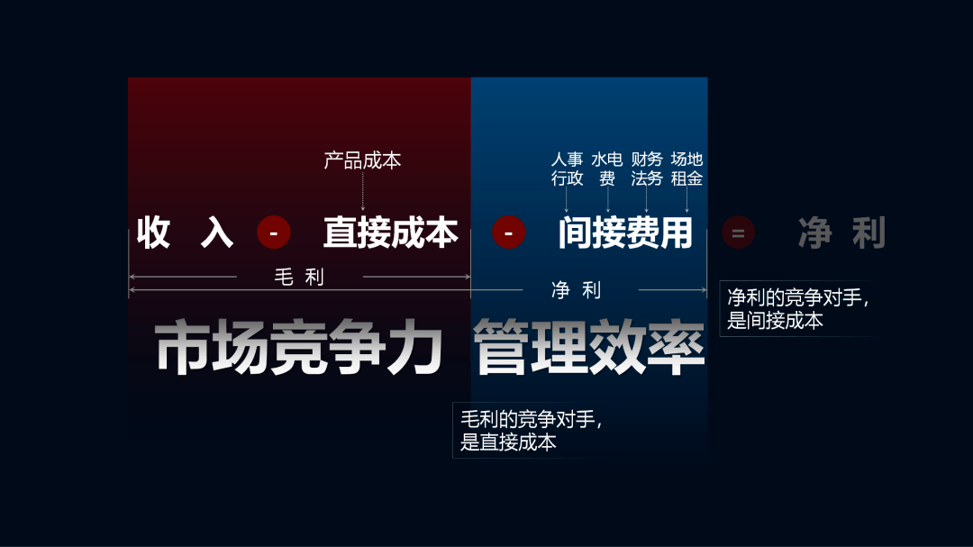 假如你的毛利很高,有500塊,但是你的管理水平很差,鋪張浪費,為了生產(chǎn)一個產(chǎn)品,間接費用竟然要1000塊,那么其實你的凈利潤是-500塊。賣得越多,虧得越多。