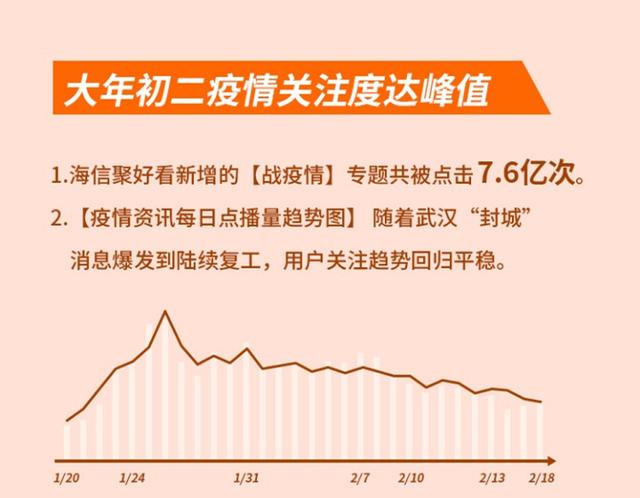 同時,與疫情相關的新聞專題和影視劇頗受關注。海信聚好看于2月1日正式上線“戰疫情”專題,截至2月18日點擊率達7.6億次。從疫情資訊每日點播量趨勢圖來看,1月26日(正月初二)疫情關注度達到峰值,隨著全國支援武漢有力措施展開,到復工后逐步回歸平穩。