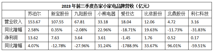 當然,行業中也并非沒有例外,小熊電器就是其中之一,最新財報數據顯示,小熊電器2023年前三季度,公司營業收入為33.18億元,同比增長22.96%。歸屬于上市公司股東的凈利潤為3.16億元,同比增長31.24%。以營收跑贏行業,并實現了剛需品類的快速增長、新興品類的廣泛增長。