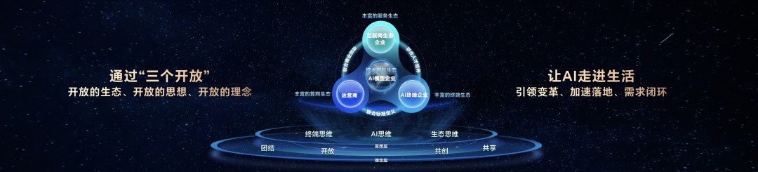 該生態(tài)聯(lián)盟將以“團(tuán)結(jié)、開放、共創(chuàng)、共享”為核心理念,圍繞“終端思維、AI思維、生態(tài)思維”的三層思維架構(gòu),通過聯(lián)合技術(shù)創(chuàng)新、標(biāo)準(zhǔn)定義、商業(yè)創(chuàng)新和人才培養(yǎng)等多方面的協(xié)同合作,解決AI落地的難題。