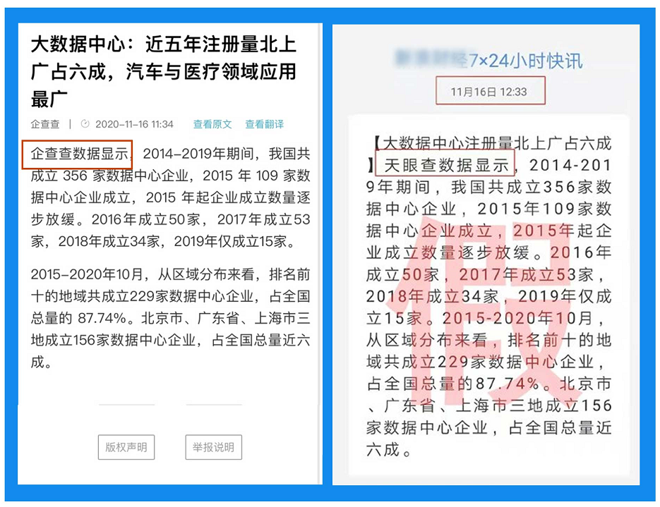 1,兩大龍頭打架,到底咋回事? 企查查對天眼查的控訴,主要集中在幾個部分: 首先,企查查認(rèn)為天眼查在基礎(chǔ)企業(yè)數(shù)據(jù)上,存在侵權(quán)、盜竊行為。 從“控訴書”可以看到,天眼查網(wǎng)站上的多個企業(yè)信息顯示中,均存在企查查的字樣,被控訴為“不正當(dāng)盜竊行為”、“明目張膽”、大部分被巧妙的掩蓋處理”。 其次,企查查認(rèn)為自己的大數(shù)據(jù)分析也屢遭竊取,具有知識產(chǎn)權(quán)的信息被盜用。 從“控訴書”中指出,2020年11月,企查查大數(shù)據(jù)研究院發(fā)布《我國新基建研究報告》,而在報告發(fā)布不到一小時,天眼查便發(fā)布了一條名為《大數(shù)據(jù)中心注冊量北上廣占六成》的快訊,唯一差別是報告里的“企查查”變成了“天眼查”,其它內(nèi)容一字不差。