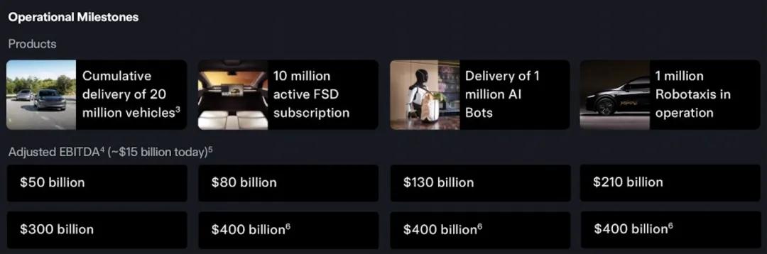 除了上述四大支柱,這個計劃還綁定了一系列持續增長的 EBITDA(稅息折舊及攤銷前利潤)目標,從 500 億美元起步,直至驚人的 4000 億美元。這確保了特斯拉在追求規模擴張的同時,必須保持強大的盈利能力和健康的現金流