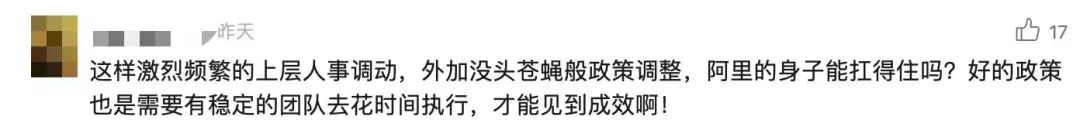 眼下,面對變化急劇的阿里,也有人提出質疑:“這樣激烈頻繁的上層人事調動,外加沒頭蒼蠅般政策調整,阿里的身子能扛得住嗎?”