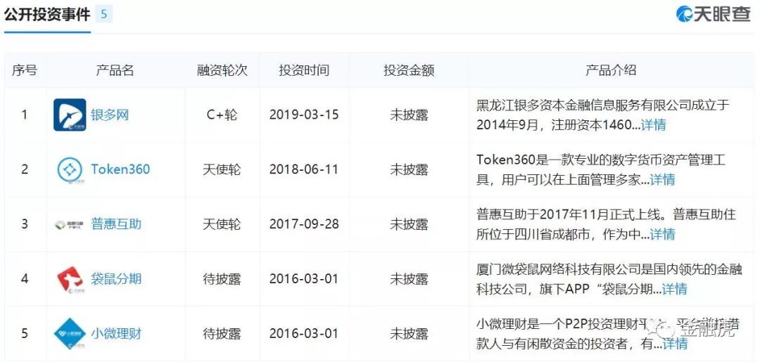 金融虎注意到,元一九鼎目前公開的多起投資均為互金類企業,包括小微理財、袋鼠分期、普惠互助和Token360,不過關于具體的投資金額均無明確披露。