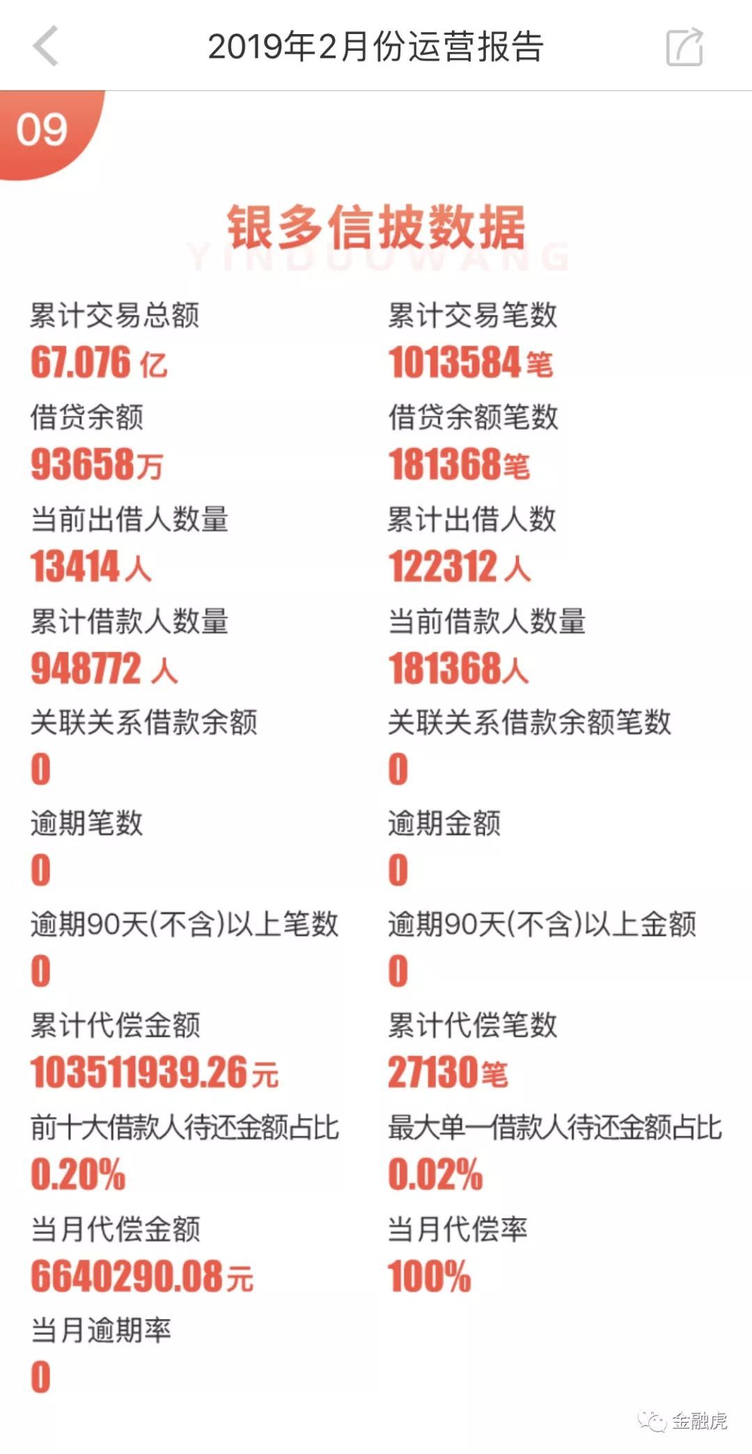 平臺運營數據顯示,截至目前,平臺已運營1516天,累計撮合交易額突破156億元,注冊用戶達60.8萬人。據平臺2月份運營報告顯示,借貸余額為9.36億元,借貸余額筆數為181368筆。平臺累計代償金額為1.03億余元。