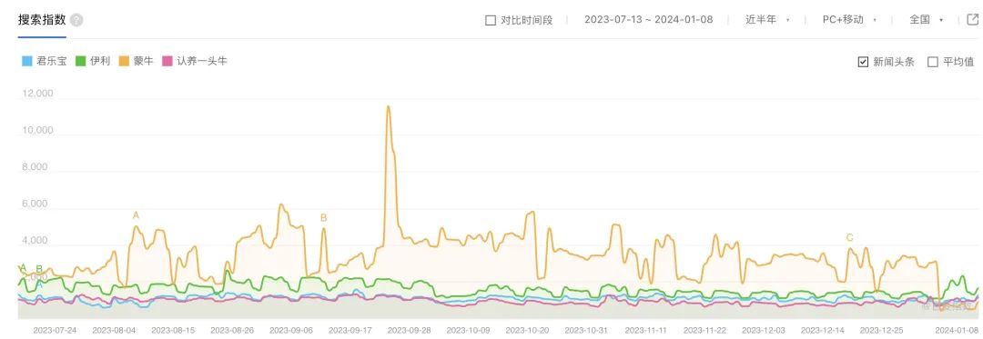 根據百度指數近半年的數據,在蒙牛、伊利、君樂寶、認養一頭牛一眾乳企中,君樂寶的熱度表現并不遜色,不僅持續領先于認養一頭牛,與伊利之間的差距也不算大。