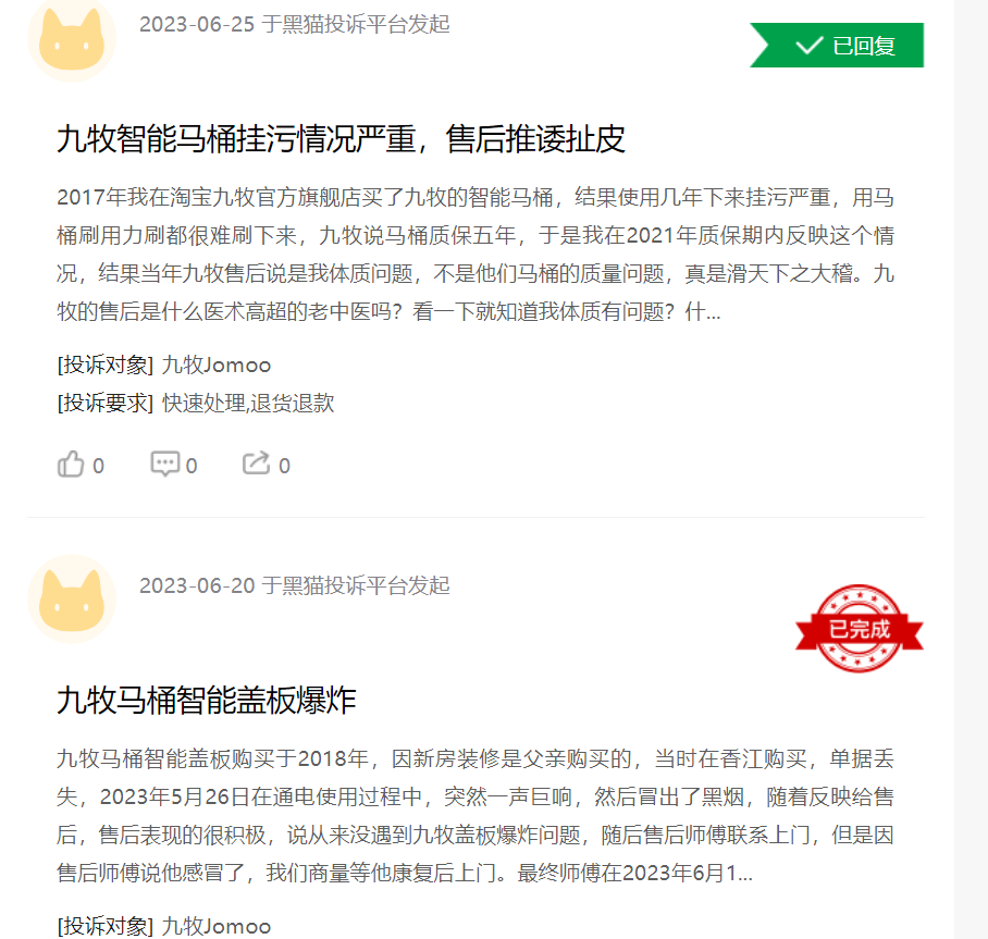 以智能馬桶為例,在“黑貓投訴”平臺搜索“智能馬桶”等關(guān)鍵詞,可以發(fā)現(xiàn)上千條投訴內(nèi)容,如貨不對板、維修困難、掛污嚴重甚至馬桶蓋爆炸等等。當然,這些問題仍屬于需進一步考證,我們對此不置可否。