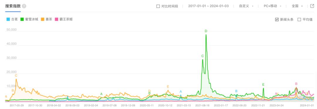 為了進一步求證這一情況,伯虎財經在百度指數上進行了多番對比。自2017年以來,對比古茗、蜜雪冰城、喜茶、霸王茶姬的搜索指數,古茗整體“墊底”,與蜜雪冰城保持著較大的熱度差距,更是被2023年走紅的霸王茶姬“遙遙領先”。