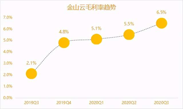 與此同時,金山云的整體毛利率也正在持續(xù)改善。三季度的毛利率為6.5%,這是自2019年Q3以來毛利率連續(xù)5個季度為正,而且毛利率持續(xù)提高的趨勢也非常明顯。