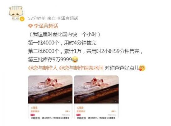 在2018年,《戀與制作人》的流水達到了驚人的12億,2019年也有6億,2020年的月度流水基本在2000—4000w上下搖擺。哪怕是在四年后的今天,《戀與制作人》的衍生周邊—單價286元的「李澤言生日主題套戒」,在不到十天里售出了1.7萬份,帶來了500萬元的銷售額。