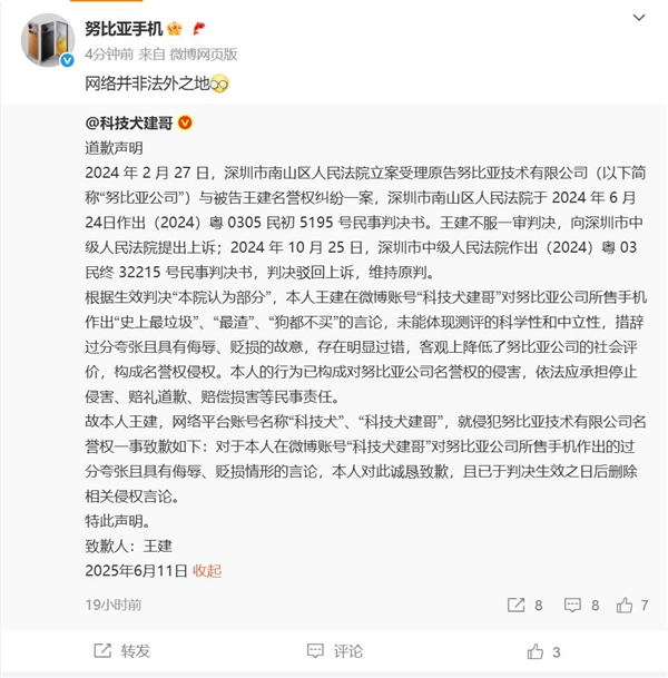 博主表示,他已刪除了相關(guān)侵權(quán)言論,并對(duì)自己的不當(dāng)行為表示誠(chéng)摯的歉意。努比亞公司的官方微博賬號(hào)轉(zhuǎn)發(fā)了這條道歉聲明,并強(qiáng)調(diào)網(wǎng)絡(luò)空間并非無(wú)法之地,任何人在發(fā)表言論時(shí)都應(yīng)遵守法律法規(guī),尊重他人的合法權(quán)益。