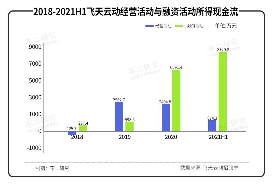 但是,「不二研究」發(fā)現(xiàn),飛天云動(dòng)經(jīng)營活動(dòng)所得的現(xiàn)金流卻有起伏:2018-2020年分別為-125.7萬元、2562.7萬元、2494.8萬元;2020年上半年及2021上半年為-1203.3萬元、874.3萬元。
