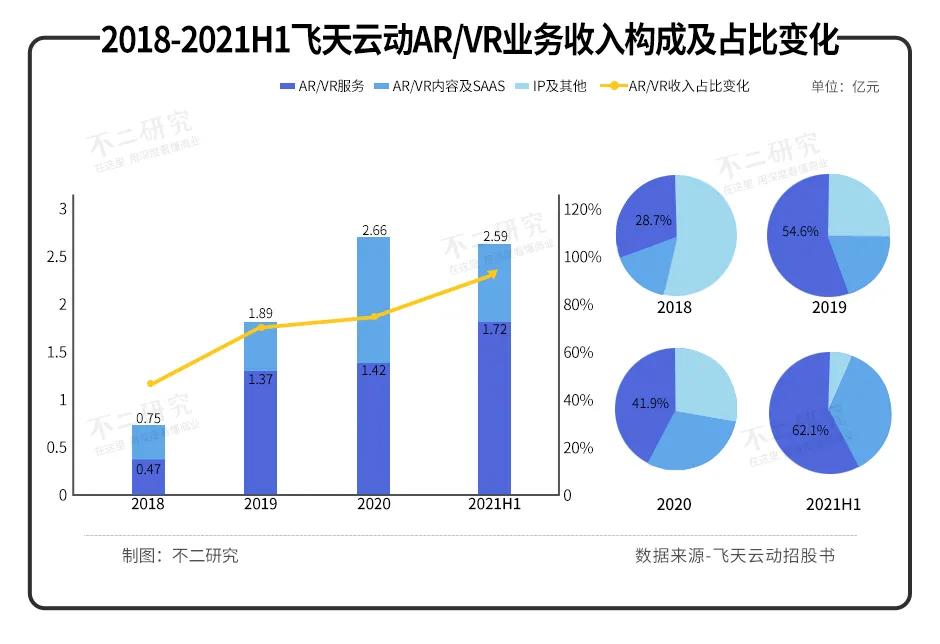 2018-2020年及2021上半年,來自AR/VR服務(wù)的收入為4710.2萬元、13710.3萬元、14170.1萬元及17247.9萬元,當(dāng)期營收占比28.7%、54.6%、41.9%及62.1%。