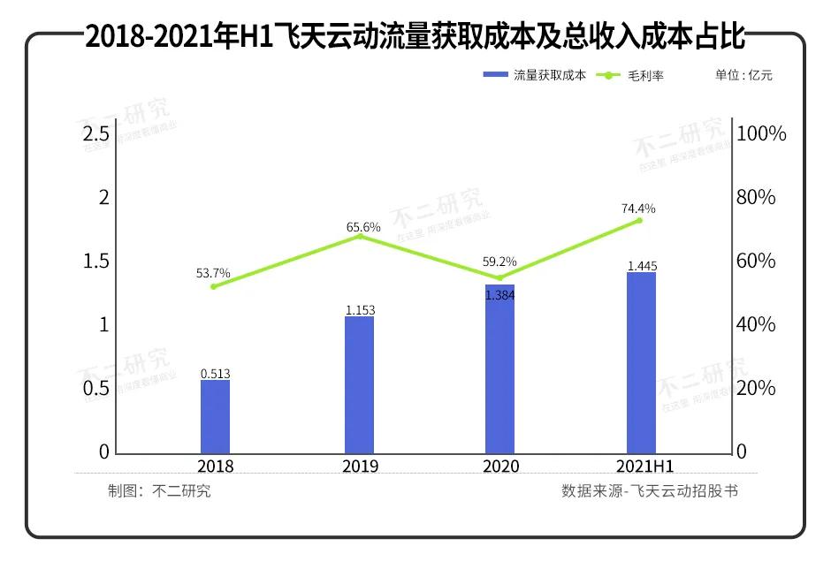 據(jù)招股書披露,2018-2020年及2021上半年,飛天云動(dòng)的流量獲取成本分別為0.513億元、1.153億元、1.384億元、1.445億元,同期總收入成本占比高達(dá)53.7%、65.6%、59.2%、74.4%。