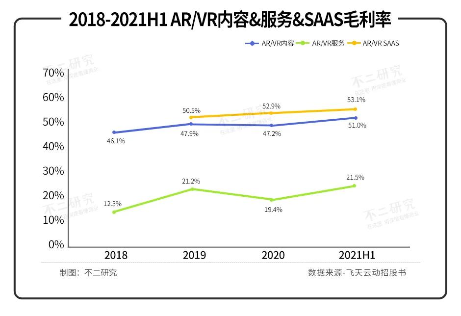「不二研究」據(jù)其招股書發(fā)現(xiàn),2021上半年,來自AR/VR服務(wù)的收入在當(dāng)期營收占比超過60%,但同期的流量獲取成本卻超過2020全年;由此,其最吸金的業(yè)務(wù)卻毛利率最低。