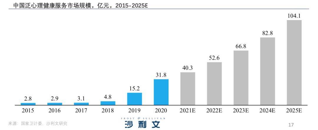 咨詢公司沙利文發布的《2022中國泛心理健康服務行業白皮書》顯示,中國泛心理健康服務市場規模由2015年的2.8億元增長至2020 年的31.8億元,年復合增長率達62.9%。據預計,2025年中國泛心理健康服務市場規模將達到104.1億元,年復合增長率將達到34.5%。