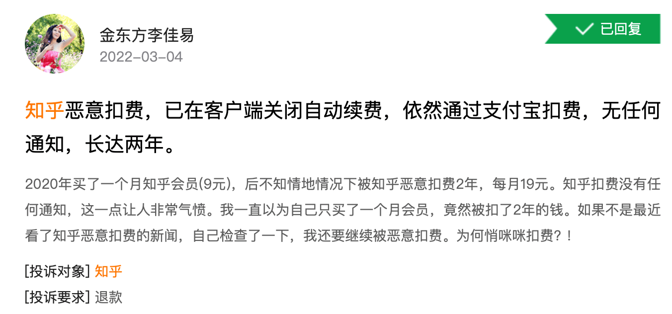 但知乎目前還存在著這類投訴,還有如此多的用戶被連續(xù)扣費幾個月甚至幾年,有媒體評論道:顯然知乎對此一直“不為所動”。