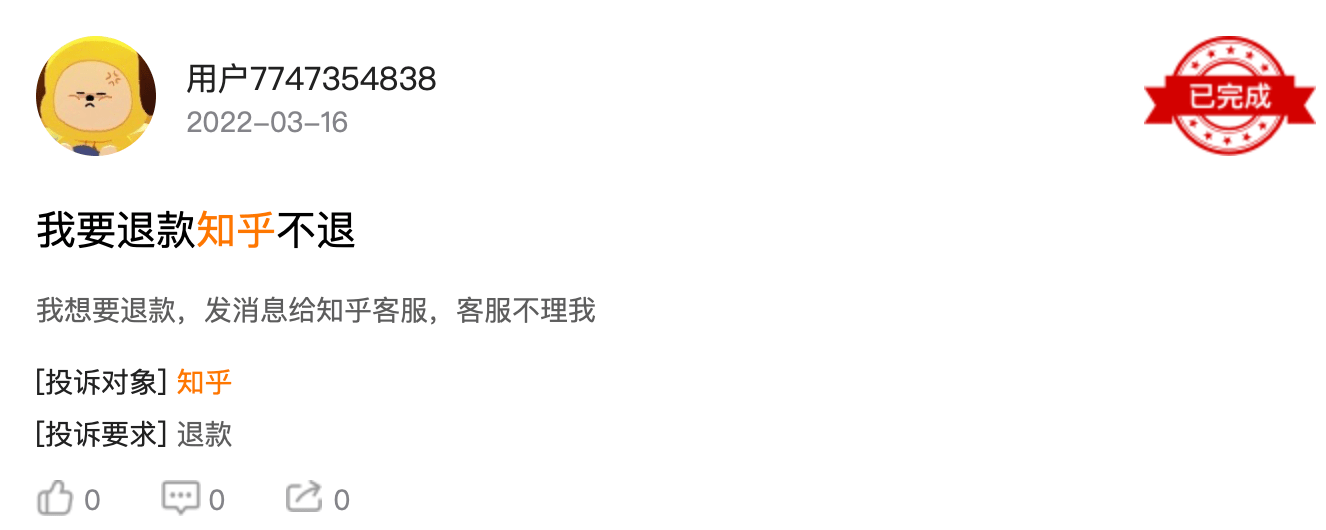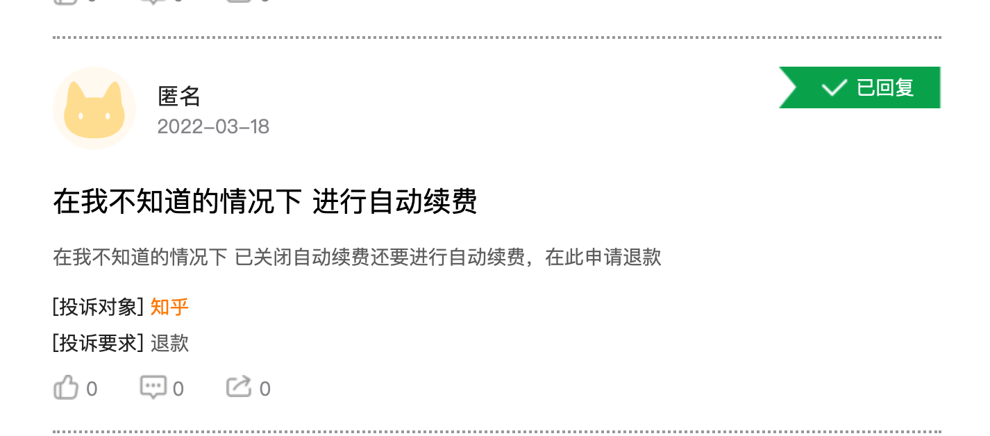 但小編近日發(fā)現(xiàn),此類問題依舊存在,還有許多用戶在投訴知乎,投訴內(nèi)容和之前基本相同,如在用戶不知情的情況下開通會員,用戶關(guān)閉自動續(xù)費后還在扣錢等等。甚至還存在著,有用戶就退費問題找到知乎客服,但客服不理人的情況。