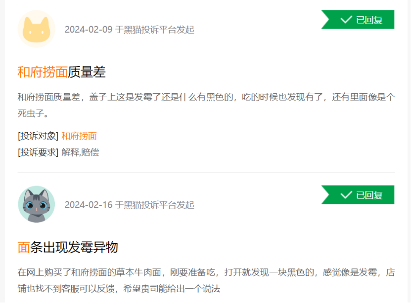 在黑貓投訴上,存在124條和府撈面相關(guān)投訴,其中內(nèi)容大多為“面條發(fā)霉”“出現(xiàn)蟲子”“蓋子黑點”等。