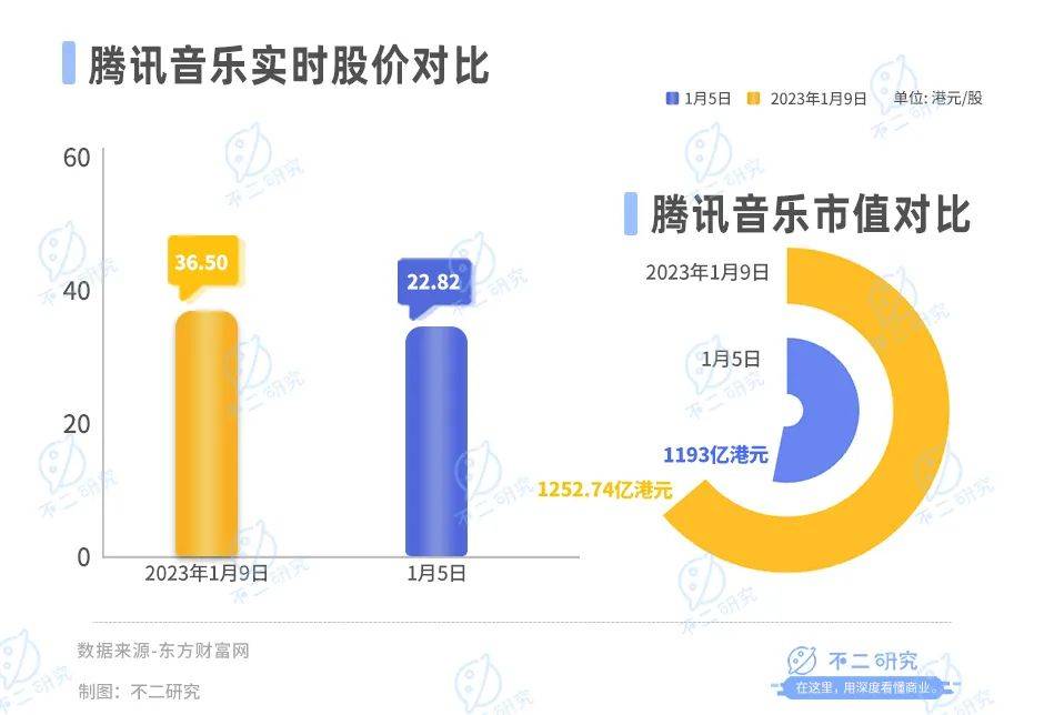 2023年首個交易日,騰訊音樂在資本市場迎來“開門紅”。截至1月5日收盤,騰訊音樂報收34.7港元/股,對應市值1193億港元(約折合人民幣1094.18億元),對比2023年1月市值高點1252.74億港元,其市值已經蒸發59.74億港元。