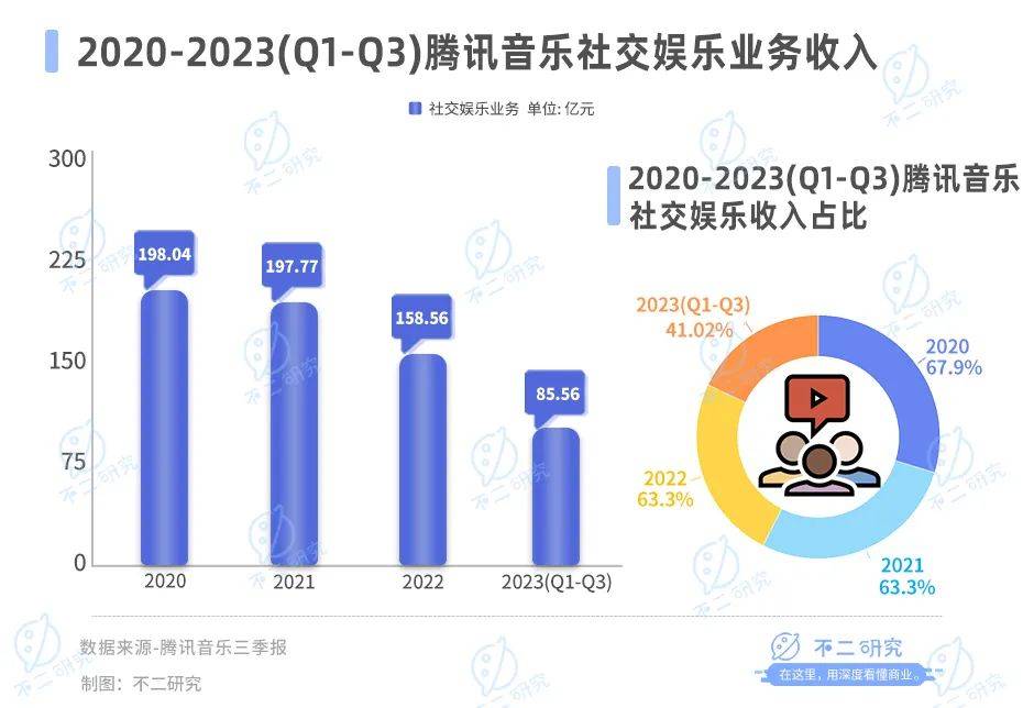 與此同時,社交娛樂服務業務曾是騰訊音樂的營收支柱,但2021年Q3逐漸減少,以2023年三季度為例,其社交娛樂服務業務收入為85.56億元,同比下降48.8%。