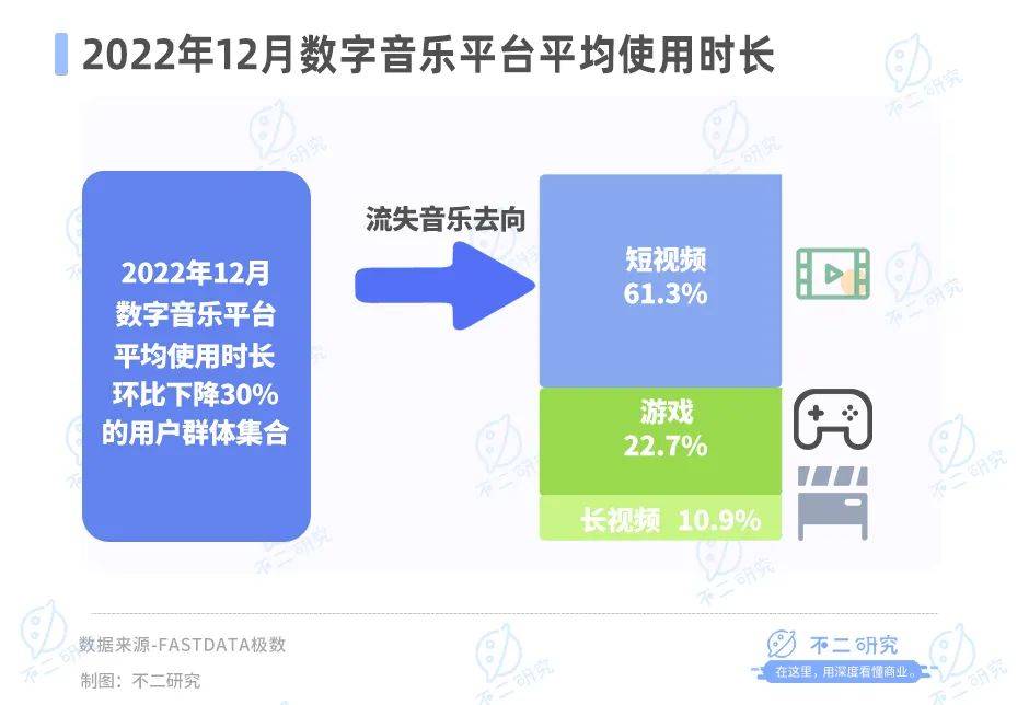 Fastdata極數發布的《2022年中國在線音樂行業報告》顯示,2022年12月,數字音樂平臺平均使用時長環比下降30%的用戶群體,同一時間段內使用抖快短視頻平臺的時長環比增幅達61.3%。短視頻對用戶碎片時間的侵吞可見一斑。