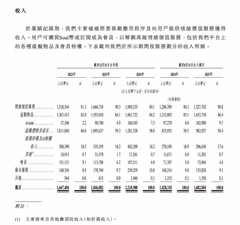 上述打賞群主的虛擬禮物不僅是Soul變現的主要方式,也是其近年來收入的主要來源。11月27日,Soul向港交所遞交招股書,擬主板掛牌上市。從招股書披露的核心財務數據來看,Soul賺錢并不靠社交軟件常見的廣告和會員費,而是賣虛擬物品。2025年前8個月AI驅動情緒價值服務(包括虛擬物品及會員特權)收入達15.27億元,占收入比例90.8%。