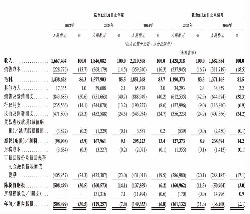 這也讓Soul長期保持高毛利率,2022年至2024年均超過80%,2025年前8個月為81.5%。