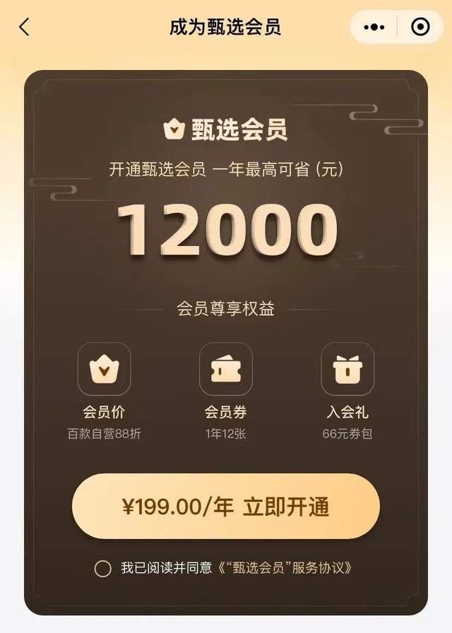 價值199元一年的甄選會員,一年凈省12000元。(圖/小程序截圖)