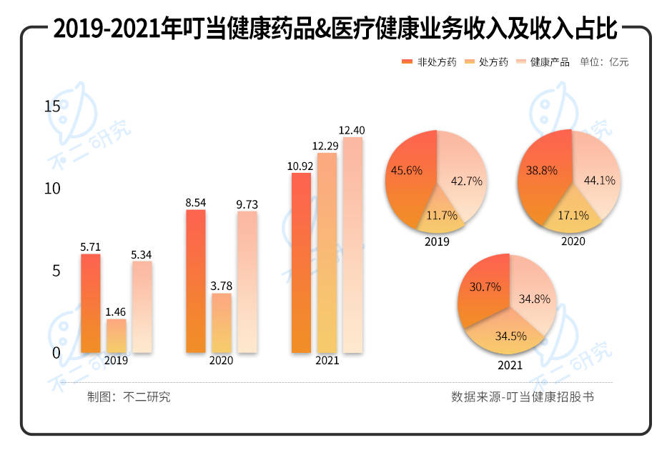 據招股書顯示,2019-2021年,來自藥品及醫療健康業務的收入分別為12.51億元、22.05億元和35.61億元,占總收入的98.1%、98.9%和96.8%,據此前招股書顯示,2018年該項業務收入為5.62億元,同比增速分別為122.5%、76.2%和61.5%。